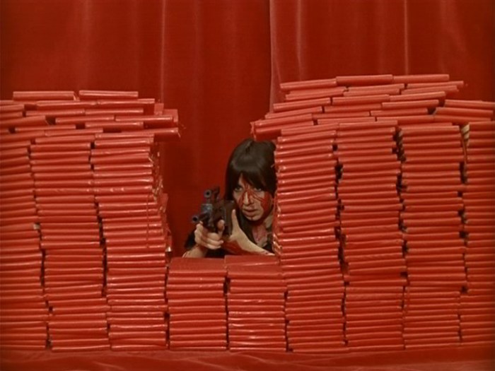 A discussion by Guillaume about film and art history later turns to a discussion of the American war in Vietnam and Indo China, acted out dramatically with Guillaume wearing several plastic novelty sunglasses with national flags to represent the political opinions of various countries in relation to the war in Vietnam, in addition to Yvonne in full costume of a Vietnamese peasant being strafed by small model planes on visible wires. Bloody, she defends herself with a toy gun behind a barricade comprised entirely of Mao’s “little red book.”