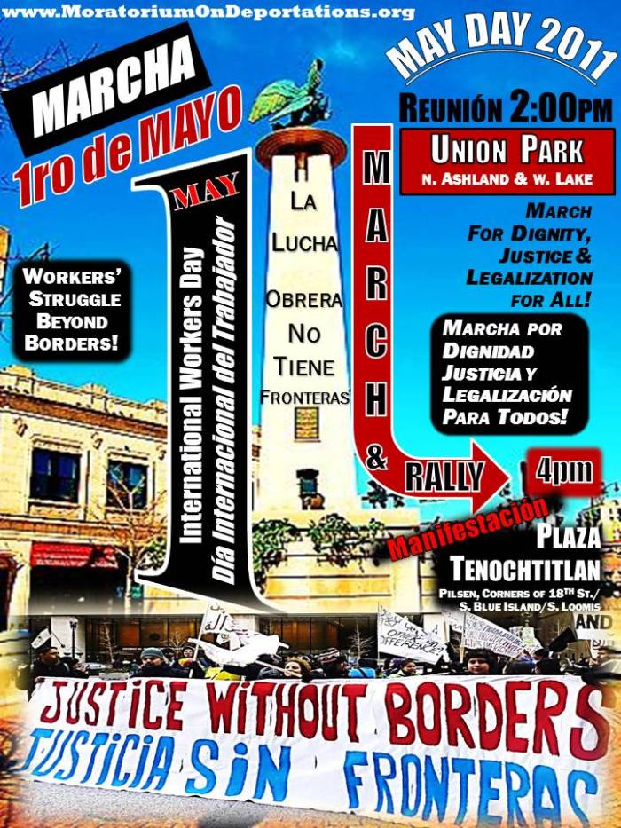 Marcha primero de Mayo 2011: La Lucha Obrera no tiene fronteras, es organizado por una coalición de pequeños grupos, miembros de la comunidad y organizadores de justicia social. La coalición fue incitada por los esfuerzos de un grupo de jóvenes indocumentados que forman la campana de “Una Moratoria a las Deportaciones”, y la cual ha crecido a través de la movilización reciente del 10 de marzo del 2011 en el Parque Unió (Plaza de la Liberación) y la acción sostenida enfrente de las oficinas de Boeing en el mismo día. Nos hemos reuniendo para contestar la llamada de jóvenes indocumentados para construir la marcha del primero de mayo a través de un proceso político que es democrático y popular. Únete a nosotros!