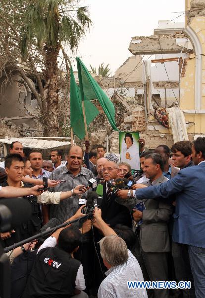 Ibrahim Al Sharif (C), Secretary of Social Affairs of Libya, speaks to the press during a tour of a damaged building after an air raid that targeted the headquarters building of the Higher Committee for Childhood in Tripoli, Libya, April 30, 2011. (Xinhua/Hamza Turkia)