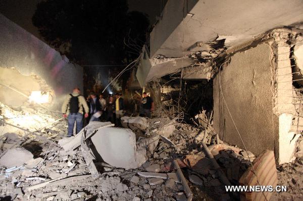 This photo taken on May 1, 2011 shows the damage of the house of the Libyan leader Muammar Gaddafi after an air raid during a tour organized by the Libyan government in the area of Gargur in Tripoli, Libya. Sayf al-Arab Kadhafi, embattled Libyan leader Moamer Kadhafi's youngest son, was killed in an airstrike on Saturday, a government spokesman said. (Xinhua/Hamza Turkia)