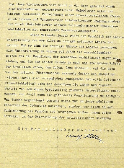 In it Hitler calls for the “uncompromising removal” of Jews from German society.