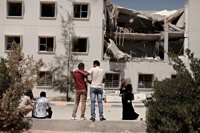 Though the Geography Department building at Al-Fatah University was partially destroyed in a June 17 bombing, the next day student life resumed. The war has not broken the spirits of Libya’s youth. – Photo: Moises Saman, New York Times