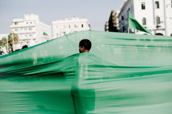 Green flags of the Libyan Jamahiriya are flown everywhere from Tunisia to Tripoli. Many of the flags in the countryside are handmade. – Photo: Moises Saman, New York Times