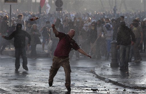 At least 70 people were injured, three of them seriously, as police fought masked rioters with tear gas, water cannon and batons.