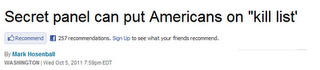 So a panel operating out of the White House — that meets in total secrecy, with no known law or rules governing what it can do or how it operates — is empowered to place American citizens on a list to be killed by the CIA, which (by some process nobody knows) eventually makes its way to the President, who is the final Decider. It is difficult to describe the level of warped authoritarianism necessary to cause someone to lend their support to a twisted Star Chamber like that; I genuinely wonder whether the Good Democrats doing so actually first convince themselves that if this were the Bush White House’s hit list, or if it becomes Rick Perry’s, they would be supportive just the same. Seriously: if you’re willing to endorse having White House functionaries meet in secret — with no known guidelines, no oversight, no transparency — and compile lists of American citizens to be killed by the CIA without due process, what aren’t you willing to support?