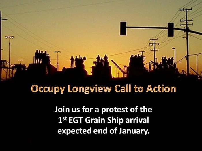 ILWU rank and file, Occupies in Longview, Portland, Seattle, Oakland, LA and other West Coast Occupies are organizing to blockade a grain ship coming to Longview. This ship is intended to load scab cargo from the EGT terminal. The date won’t be known until 3-4 days in advance, but is anticipated to be sometime in January.