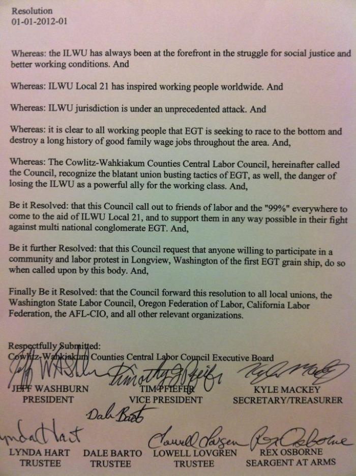Caravans to Longview and support actions are being organized up and down the West Coast, nationally and internationally, to arrive in Longview to greet the STX ship coming to load the scab grain. The Bay Area’s ILWU Local 10 has pledged support for ILWU Local 21’s struggle against EGT and their union busting drive, funding a bus to Longview. The San Francisco Labor Council is on board.