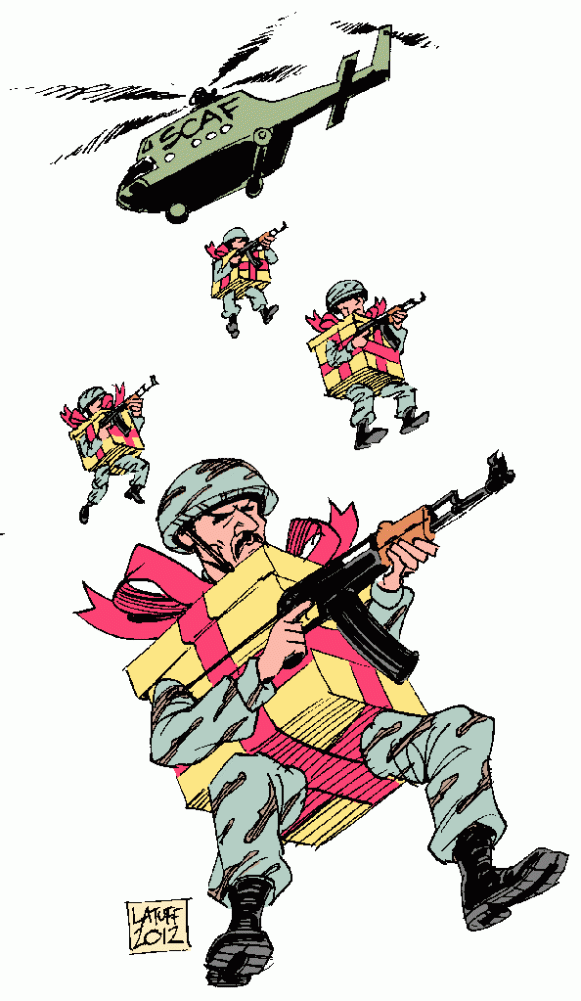 ‘scaf-gifts-2’ Published January 20, 2012 at 594 × 1023 in Political Cartoons: SCAF Helicopters Drop “Gifts” to Celebrate Jan 25 Revolution in Egypt ‹ Back
