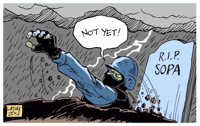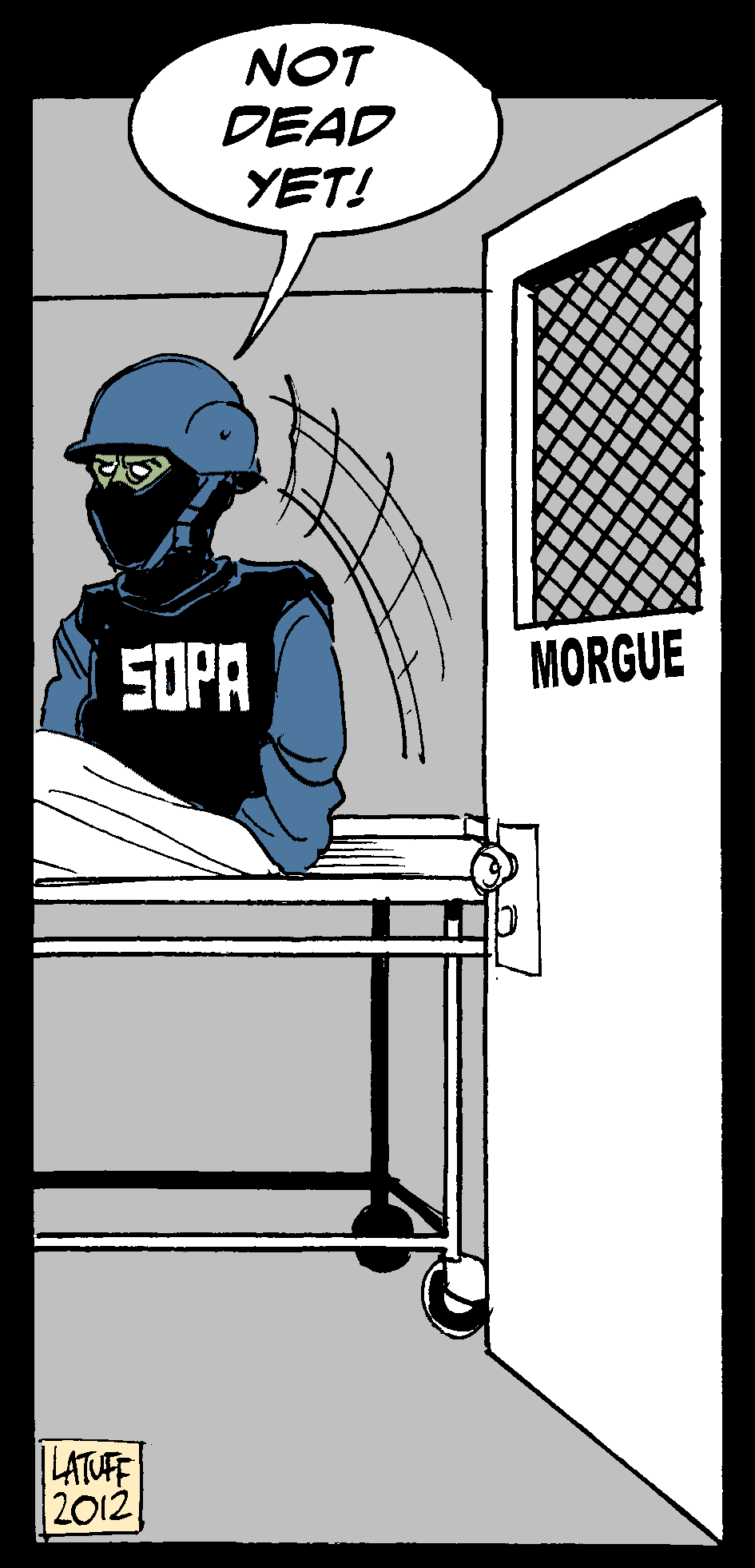 Political Cartoon: Warning! SOPA is not Dead Yet! By The Red Phoenix on January 22, 2012 • ( 0 ) Source Share this: Click to share on Print & PDF (Opens in new window) Print & PDF Click to email a link to a friend (Opens in new window) Email Click to share on Facebook (Opens in new window) Facebook Click to share on X (Opens in new window) X More Click to share on Reddit (Opens in new window) Reddit Click to print (Opens in new window) Print Click to share on LinkedIn (Opens in new window) LinkedIn Click to share on Tumblr (Opens in new window) Tumblr Like Loading...‹ Copyrights: Feds push a few novel theories in MegaUpload casePolitical Cartoon: Internet Wars just begun! Struggle against Sopa/Pipa is NOT over! ›Categories: Internet, Media & Culture, Movies, Music, Political Cartoons, TV, Workers Struggle