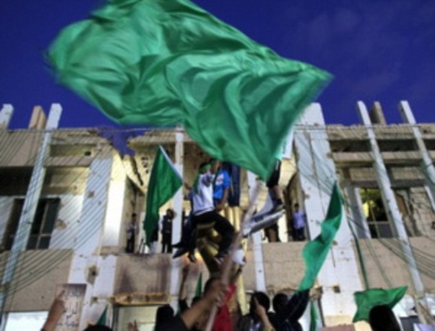 Celebration: A photo, reportedly from Bani Walid which appeared on a Libyan website, shows a green flag being raised as Gaddafi loyalists re-captured the town