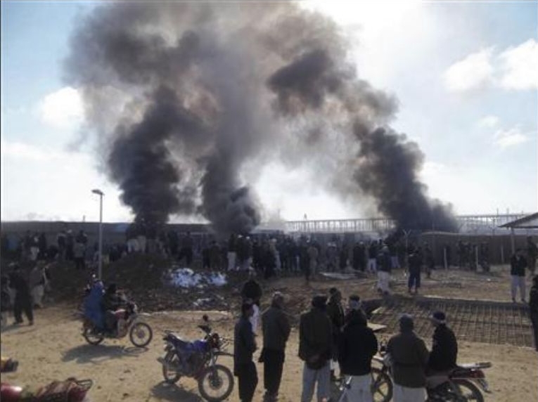Afghans watch as smoke billows from inside the parking area of a Norwegian-led military base during a protest in Faryab province February 23, 2012.