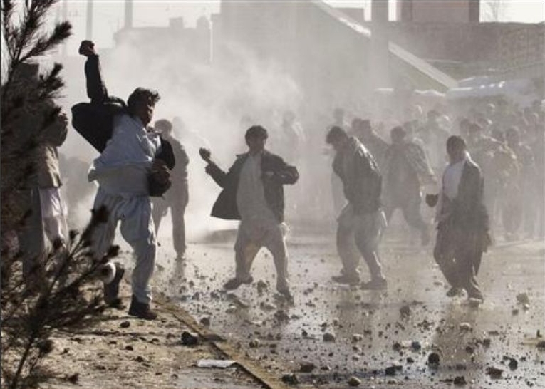 Afghan protesters throw rocks towards a water canon near a U.S. military base in Kabul February 22, 2012.