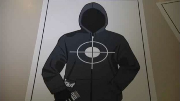 The targets reportedly do not show Martin’s face, but feature a hoodie with crosshairs aimed at the chest. A bag of Skittles is tucked in the pocket and a hand is holding a can resembling iced tea. Martin reportedly was carrying both items the night of his death.