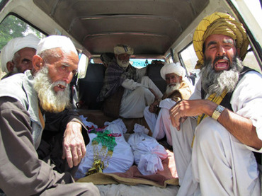 Afghan villagers sit on the back of a vehicle carrying dead bodies of children who were killed in a NATO airstrike on a home in Sajawand village in Logar province south of Kabul on June 6, 2012 (AFP Photo/Sabawoon Amarkhil)