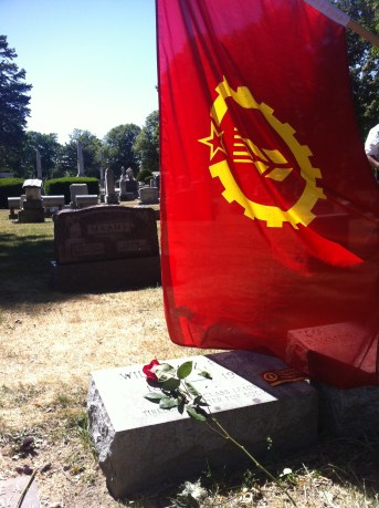 Concluding ceremonies for “The Congress of the Flags” were held at the Haymarket Memorial in suburban Chicago. Comrades of the APL, carrying red flags with images of the Party’s grain & gear symbol, laid flowers at the monument to the Haymarket Martyrs and before the graves of such heroes/heroines of the American people as William Z. Foster and Elizabeth Gurley Flynn.