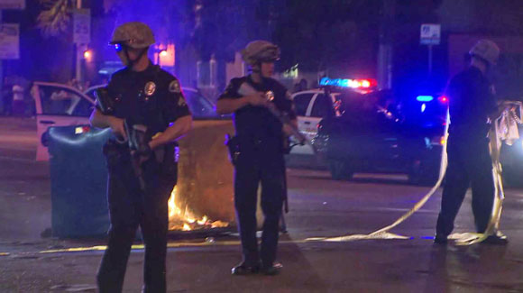 Police remained at the scene to investigate the shooting, Dunn said, and were encircled by a group of people who began throwing things, including bottles and possibly rocks, at the officers. At one point, the crowd also pushed a dumpster holding burning trash toward police, reports said.
