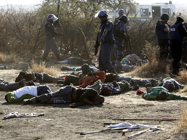 A policeman gestures in front of some of the dead miners after they were shot outside a South African mine in Rustenburg, 100 km (62 miles) northwest of Johannesburg, August 16, 2012. (Reuters/Siphiwe Sibeko)