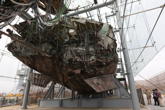 The wreckage of the Cheonan warship now sits in Pyongtaek Second Naval Command Base. A new academic study says the ship may have been sunk by a mine instead of a North Korean torpedo. In this photo, Hankyoreh reporters speak with the base’s PR staff on August 16. (by Lee Jeong-ah, staff reporter)