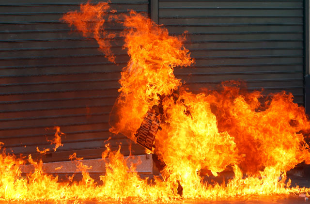 A riot policeman is engulfed by flames after a protester threw petrol bombs in Athens’ Syntagma square during a 24-hour labour strike.(Reuters / Yannis Behrakis)
