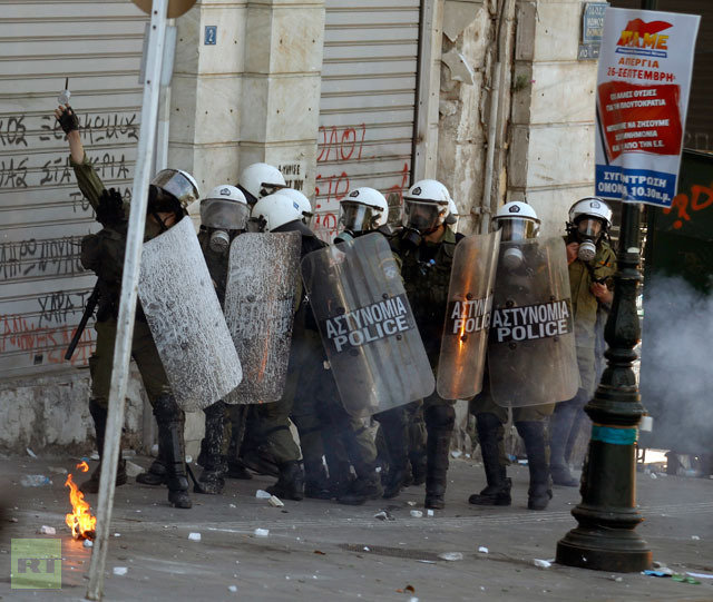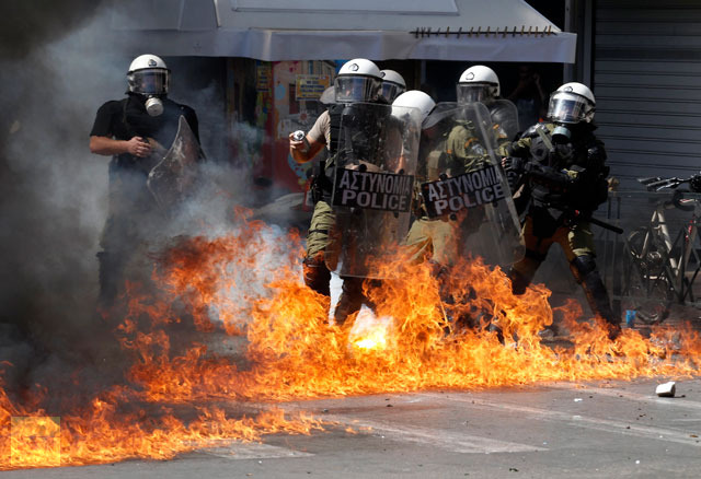 Photo by user jamesmatesitv shows petrol bombs hitting ranks of riot police during an anti-austerity rally at Syntagma Square in Athens on September 26, 2012 (Image from Twitter.com)