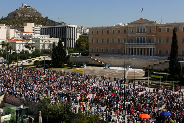 Around 70,000 people, as estimated by Reuters, gathered in front of the parliament for the country’s biggest anti-austerity protest since the new government came to power.