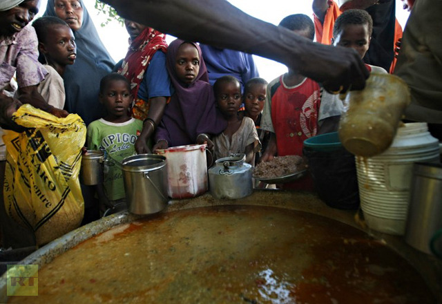 Internally displaced children line up to receive a food ration at a food distribution point at a voluntary centre in Mogadishu, Somalia. (AFP Photo / Mohamed Dahir)
