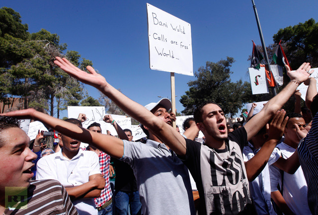 Libyan protesters from the city of Bani Walid hold slogans during a protest outside the National Congress in Tripoli on October 7, 2012 (AFP Photo / Mahmud Turkia)