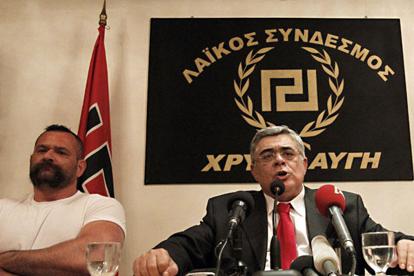 ‘0507-goldendawn_full_600’ Published October 11, 2012 at 600 × 400 in Greek police collude with fascist Golden Dawn group Golden Dawn leader Nikolaos Michaloliakos speaks during a news conference. ‹ Back