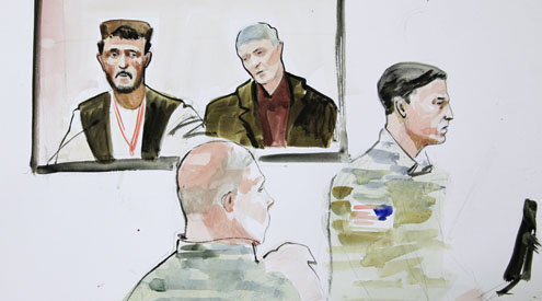 In this courtroom sketch, U.S. Army Staff Sgt. Robert Bales, lower left, watches testimony from a man named Faizullah, on a video monitor at upper left, sitting next to a translator. At right is military prosecutor Lt. Col. Jay Morse. | Lois Silver/AP