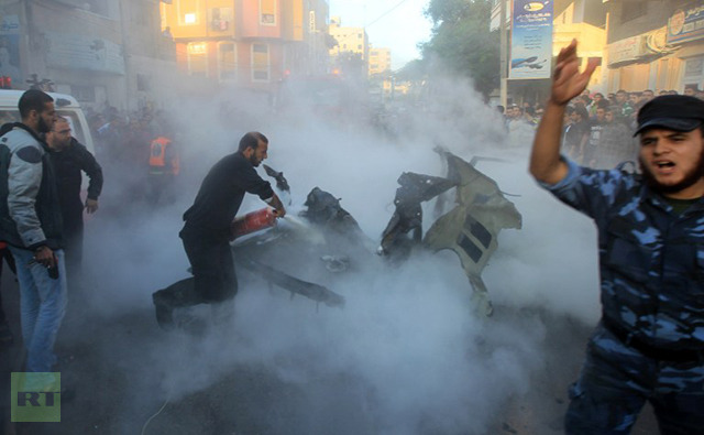 Palestinians extinguish fire from the car of Ahmaed Jaabari, head of the military wing of the Hamas movement, the Ezzedin Qassam Brigades, after it was hit by an Israeli air strike in Gaza City on November 14, 2012. (AFP Photo / Mahmud Hams)