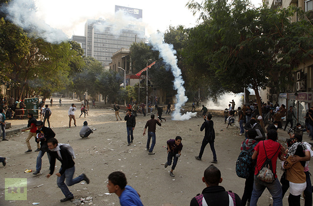 Protesters run to hide from tear gas during clashes with police near Tahrir Square as anti-Morsi protesters start to gather in the square in Cairo November 27, 2012. (Reuters / Asmaa Waguih)