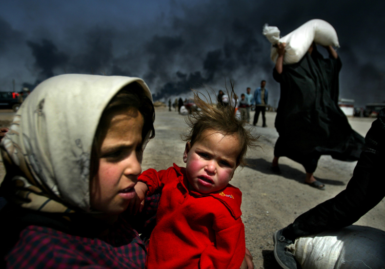 An Iraqi girl holds her sister as she waits for her mother (R) to bring over food bought in Basra, March 29, 2003