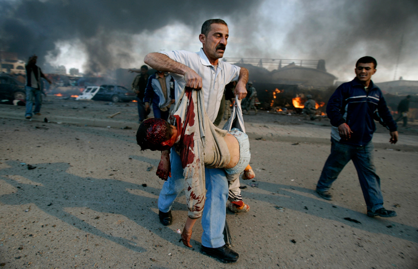 An Iraqi man holds the body of a boy after a car bomb explosion at a market in the neighbourhood known as New Baghdad, southeast of Baghdad, February 18, 2007