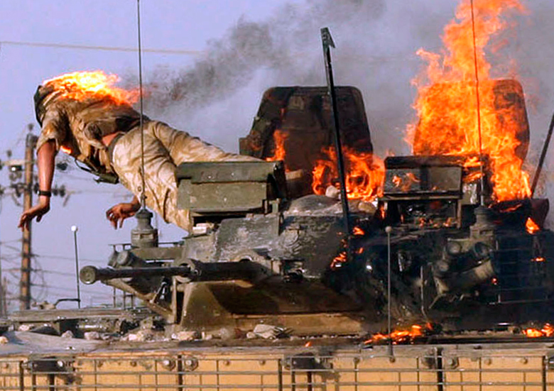 British soldier jumps from a burning tank which was set ablaze after a shooting incident in the southern Iraqi city of Basra September 19, 2005