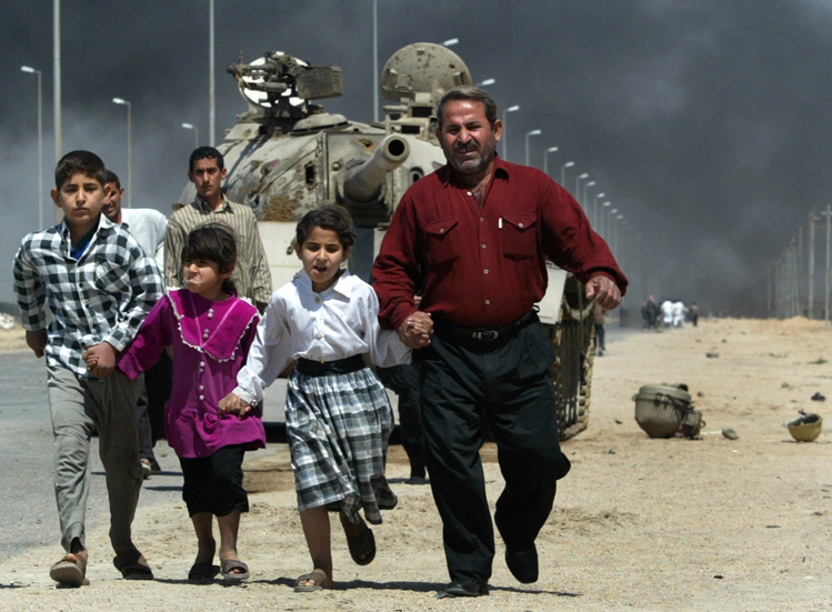 A family flees past a destroyed Iraqi T-55 tank after a mortar attack on British Army positions in the southern city of Basra March 28, 2003