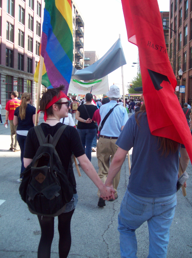 The march itself was energetic, but generally peaceful – according to official sources only a handful of arrests were made. Although the strongest demand voiced at that the march was for an end to deportations, and for full legalization of undocumented workers, slogans addressing various issues such as the Chicago School closings, police violence, and the ongoing war in Afghanistan and US intervention in the Middle East were also raised. At the conclusion of the march, a mass rally was held at Daley Plaza which featured addresses by immigrant’s rights and labor representatives, and US Senator Dick Durbin (D).