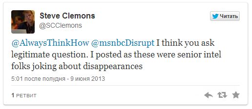 “In Dulles UAL lounge listening to 4 US intel officials saying loudly leaker & reporter on #NSA stuff should be disappeared recorded a bit,” the Atlantic’s Washington-based editor-at-large Steve Clemons tweeted on Sunday.