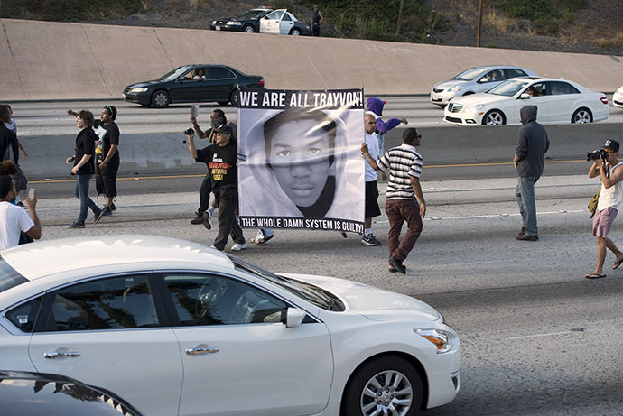 Americans angry at the acquittal of George Zimmerman in the death of black teen Trayvon Martin walk onto the 10 Freeway stopping highway traffic to protest the acquittal, in Los Angeles, California July 14, 2013. (AFP Photo / Robyn Beck)