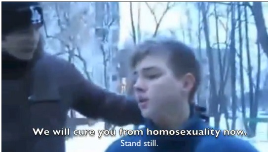 UPDATE: The Huffington Post has provided a brief translation for the following video showing what appears to be a group of young Russian Neo Nazi members interrogationing and then attacking a 15-year-old gay boy: