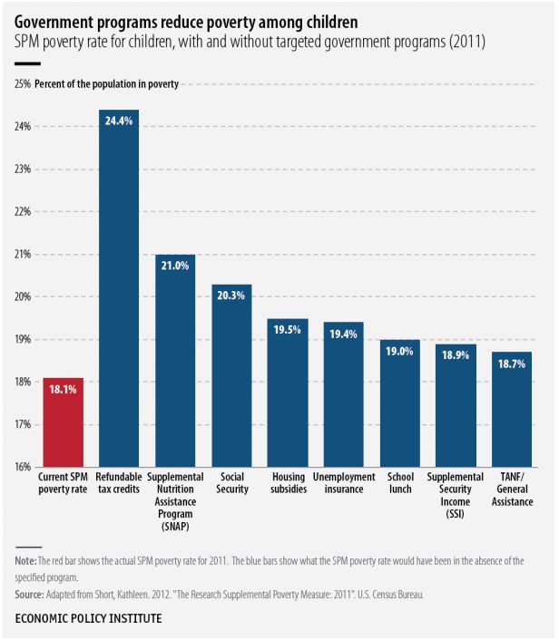 Refundable tax credits, such as the Earned Income Tax Credit, kept 6.3 percent, or 4.7 million children above the SPM poverty threshold. The Supplemental Nutrition Assistance Program (SNAP), also referred to as food stamps, kept 2.9 percent, or nearly 2.2 million children out of poverty. Other programs such as Social Security, housing subsidies, unemployment insurance, and school lunch programs have significant positive impacts on the lives of children.