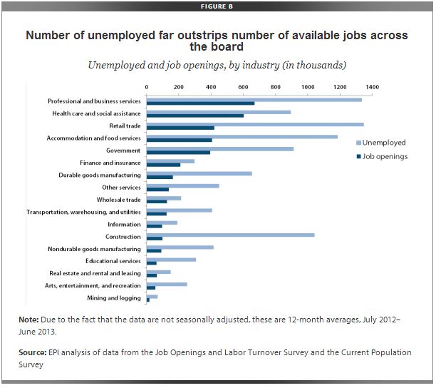 Job openings were essentially flat in June, increasing by 29,000 to 3.9 million, following an upward revision of 79,000 to the May data. Job openings are improving slowly and remain very depressed. In 2007, there were 4.5 million job openings each month, so June’s level of 3.9 million is more than 12 percent below its prerecession level. The job openings data are extremely useful for diagnosing what’s behind our sustained high unemployment. In today’s economy, unemployed workers far outnumber job openings in every major sector, as shown in Figure B. This demonstrates that the main problem in the labor market is a broad-based lack of demand for workers—not, as is often claimed, available workers lacking the skills needed for the sectors with job openings.