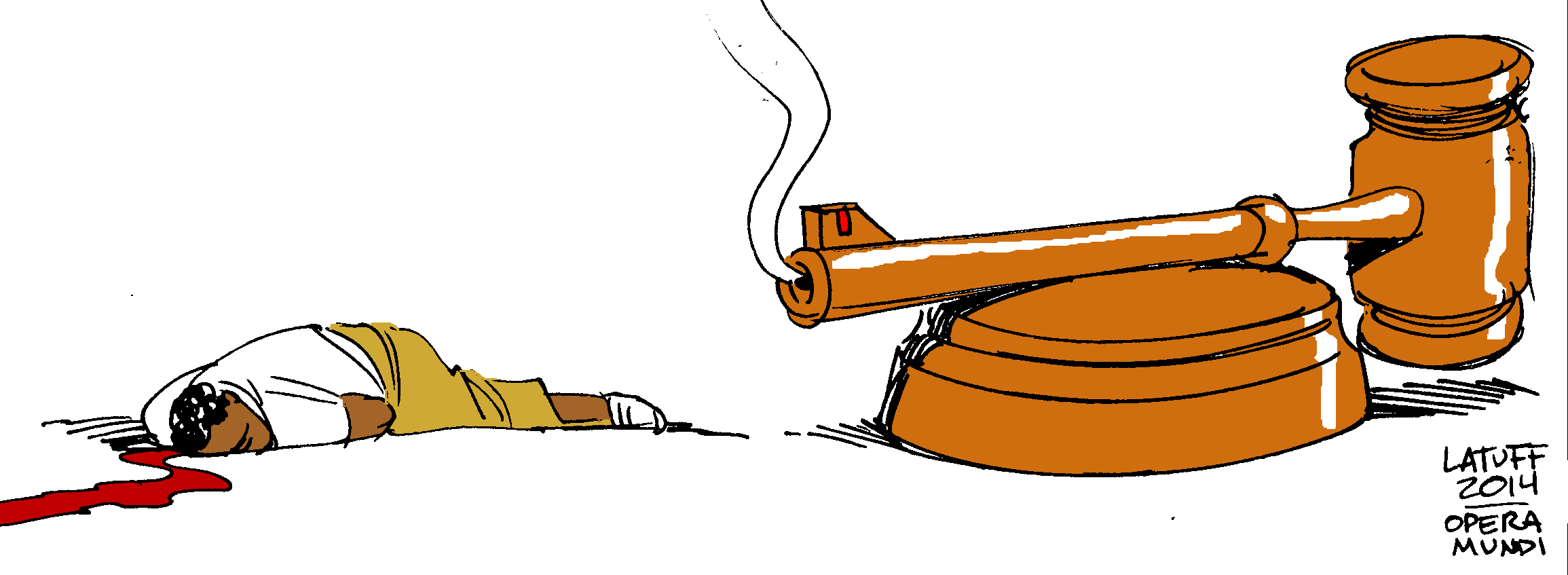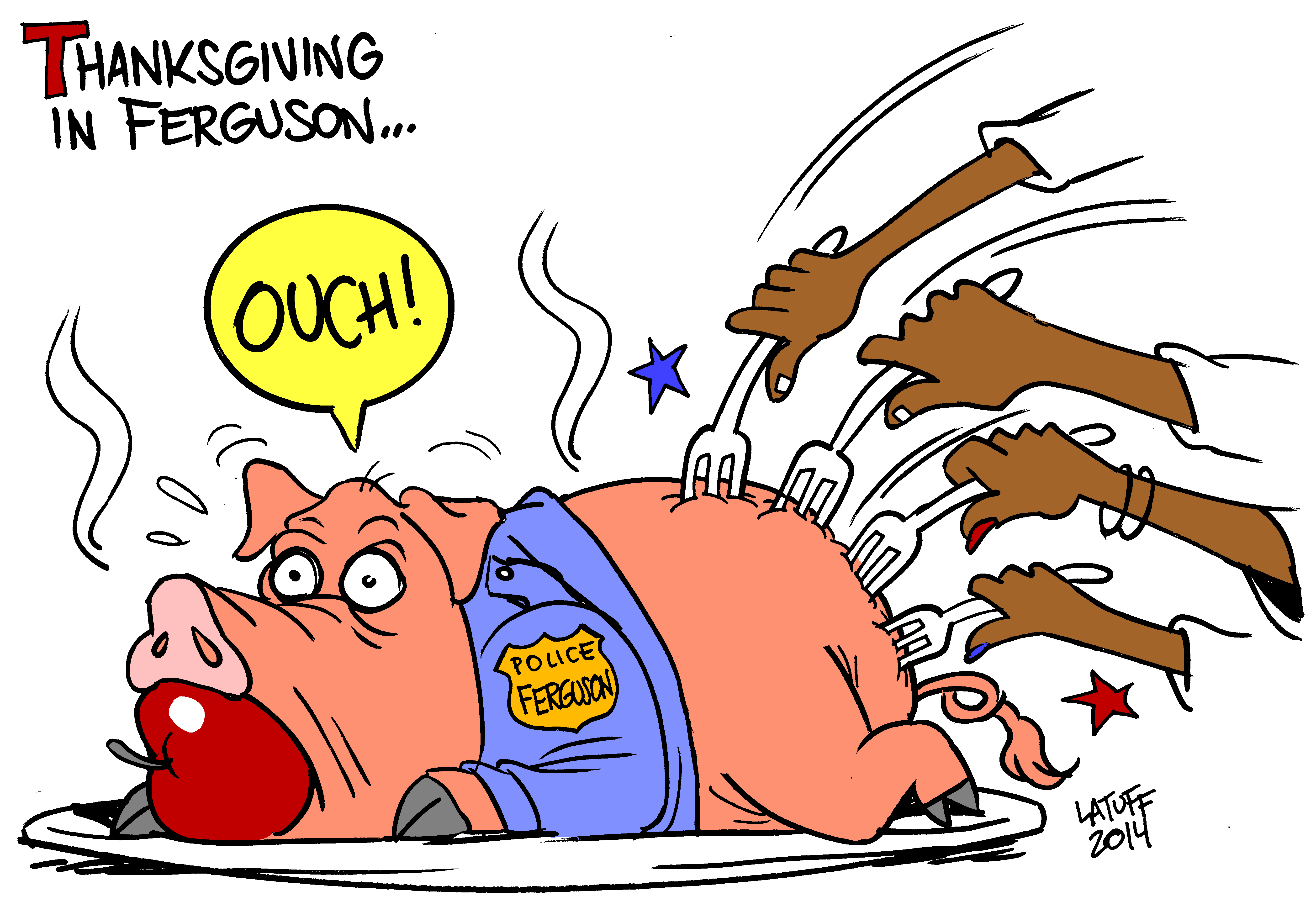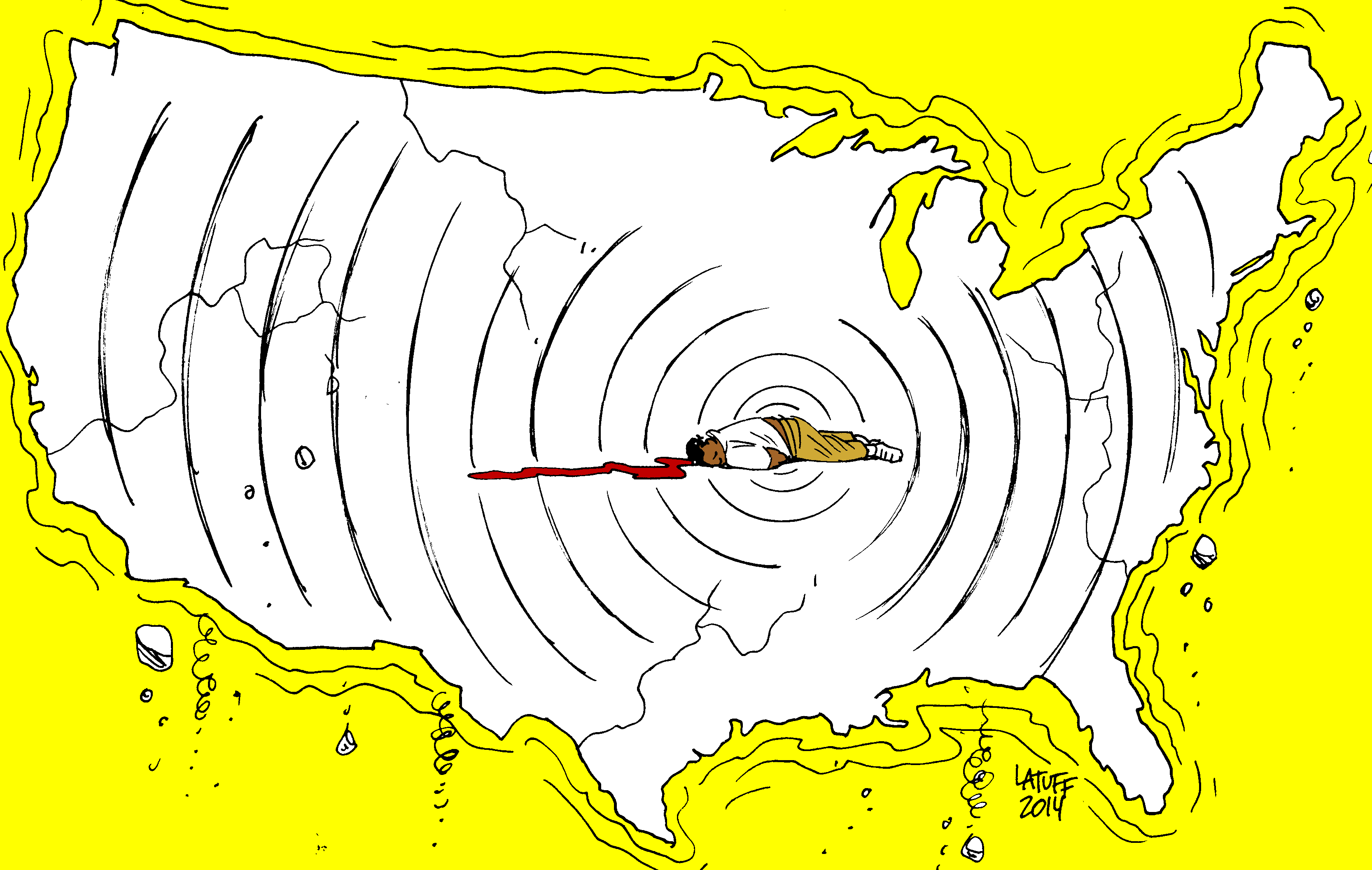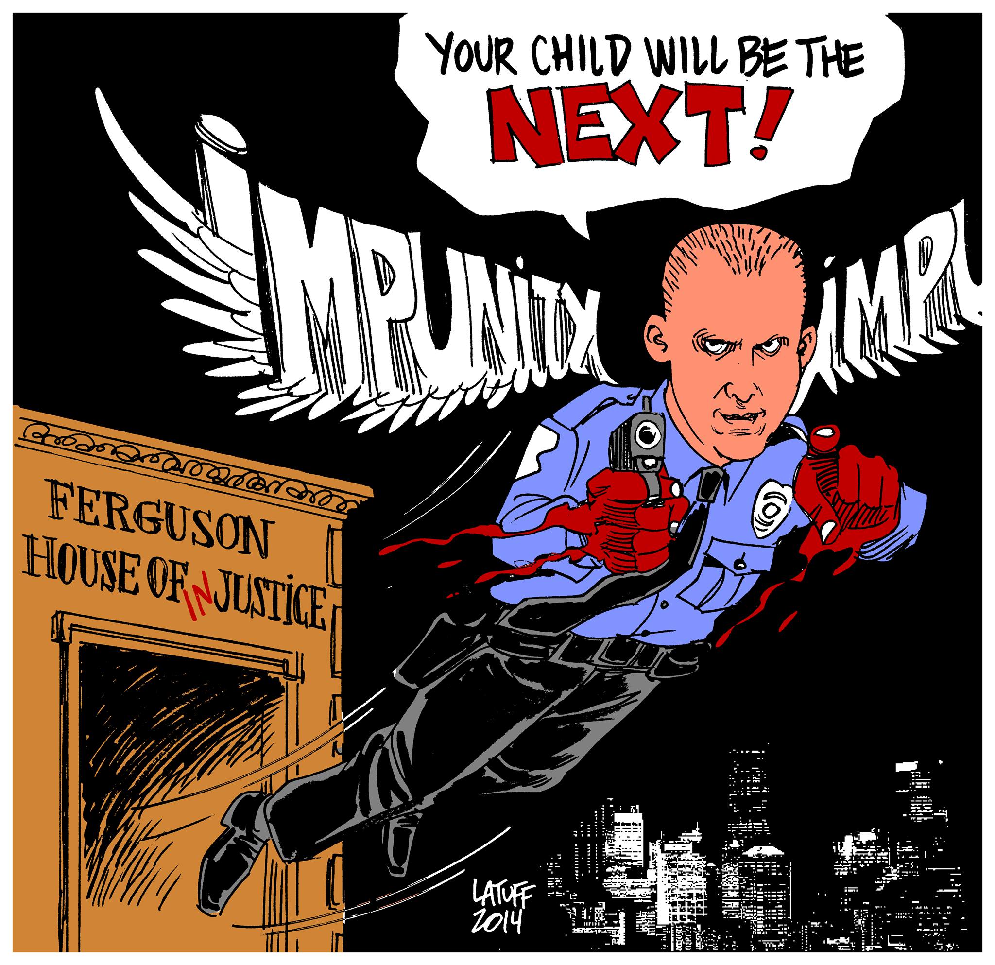 In a similar fashion to the 2012 murder of Trayvon Martin, in which the killer was also set free, the focus has now been taken away from the real issue – the racist murder of Michael Brown by Darren Wilson – to “concerns” about property damage and looting, attempting to paint the protesters in Ferguson as an unruly mob with no respect for the law. Of course, there is no talk about the long history of murder by racist police and institutional violence against black people in the U.S. In essence, violence from below is condemned while violence from above is ignored.