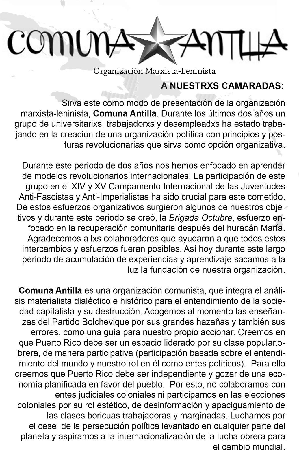 Sirva este como modo de presentación de la organización marxista-leninista, Comuna Antilla. Durante los últimos dos años un grupo de universitarixs, trabajadorxs, y desempleadxs ha estado trabajando en la creación de una organización política con principios y posturas revolucionarias que sirva como opción organizativa.