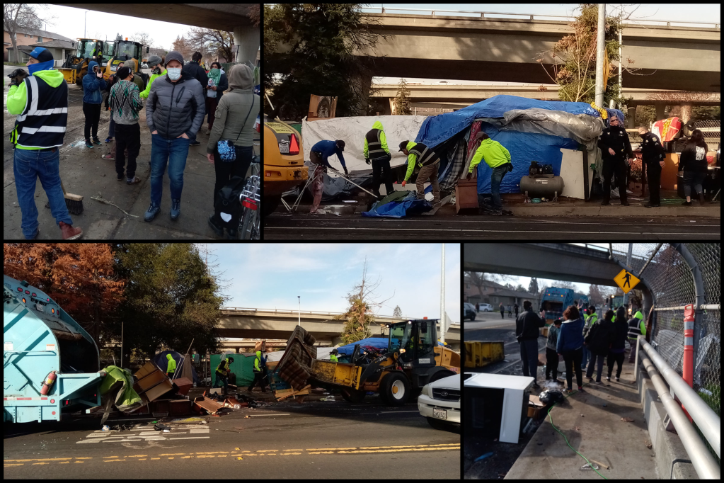 Despite the hard work and perseverance of the Sacramento Homeless Union and their allied housing advocacy groups, sweeps have continued throughout the city. On January 5th 2021, notices to vacate were given to the members of a tent city set up on the overpass of Alhambra Blvd and W St. 12 people where dwelling there and because it was on public property, they thought they would be able to ride out the pandemic at this location and had been since the ruling in July. The notices to vacate said they had to be out by January 7th and they would be given a voucher to stay in a motel for a week but they could only take two backpacks worth of possessions, everything else was to be disposed of.