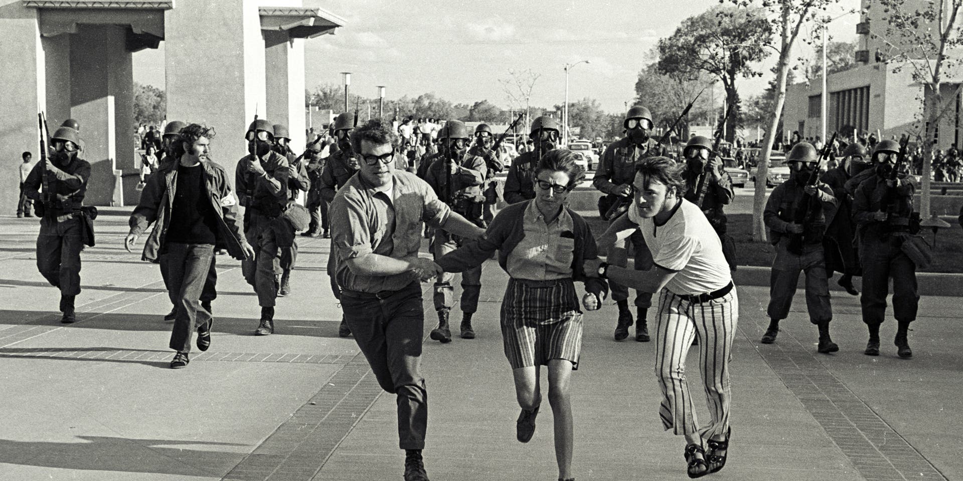 On May 4, 1970, the Ohio National Guard fired into a crowd of student demonstrators who were on strike against President Richard Nixon’s announcement to expand the Vietnam War into Cambodia. The Kent State University students in Ohio had assembled a protest on university grounds of some 2,000 people, and the National Guard attempted to disperse the large crowd of demonstrators with a bullhorn, but could not be heard over the chants and protest songs of the students. At that time tear gas was fired into the crowd with grenade launchers to push the students back, whereupon the Guards advanced in formation to the athletic grounds. The protestors surrounded the Guardsmen and chanted slogans such as “Pigs off our campus!”