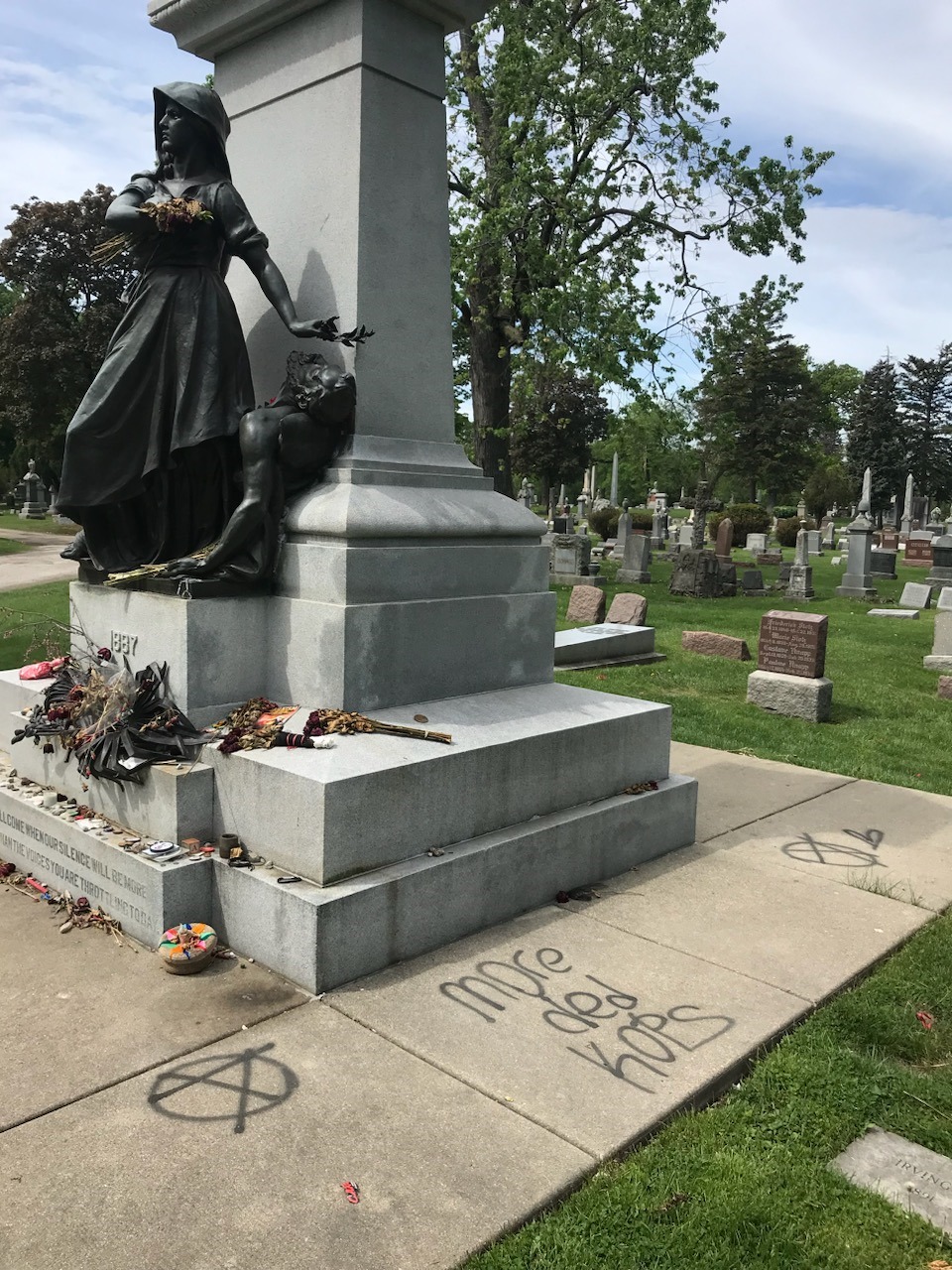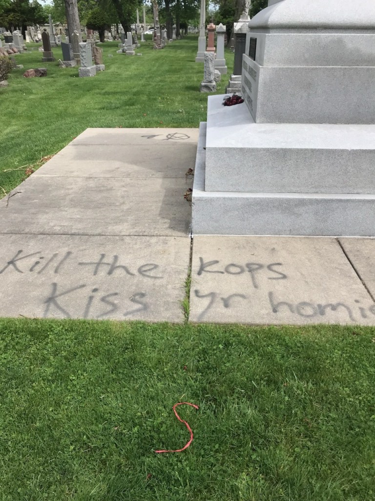 Sadly, as has happened before during May, the monument was again defaced and spray painted. The Illinois Labor History Society, the monument’s caretaker, spends $3,000 annually on monument upkeep — removing this spray paint will cost us another $1,000. We will raise the funds to do that. The questions to ask are, “How does spray painting this monument aid labor rights?” “Would the energy spent sneaking into a cemetery with spray paint better be spent actually helping organize people?” Cemeteries are sacred spaces, dear to many hearts. Those who desire self-expression can find multiple other ways to spend their time, energy and resources. We hope you will join the ILHS in preserving the important memories this monument represents and that we should all approach this spot with awe, not with spray paint.