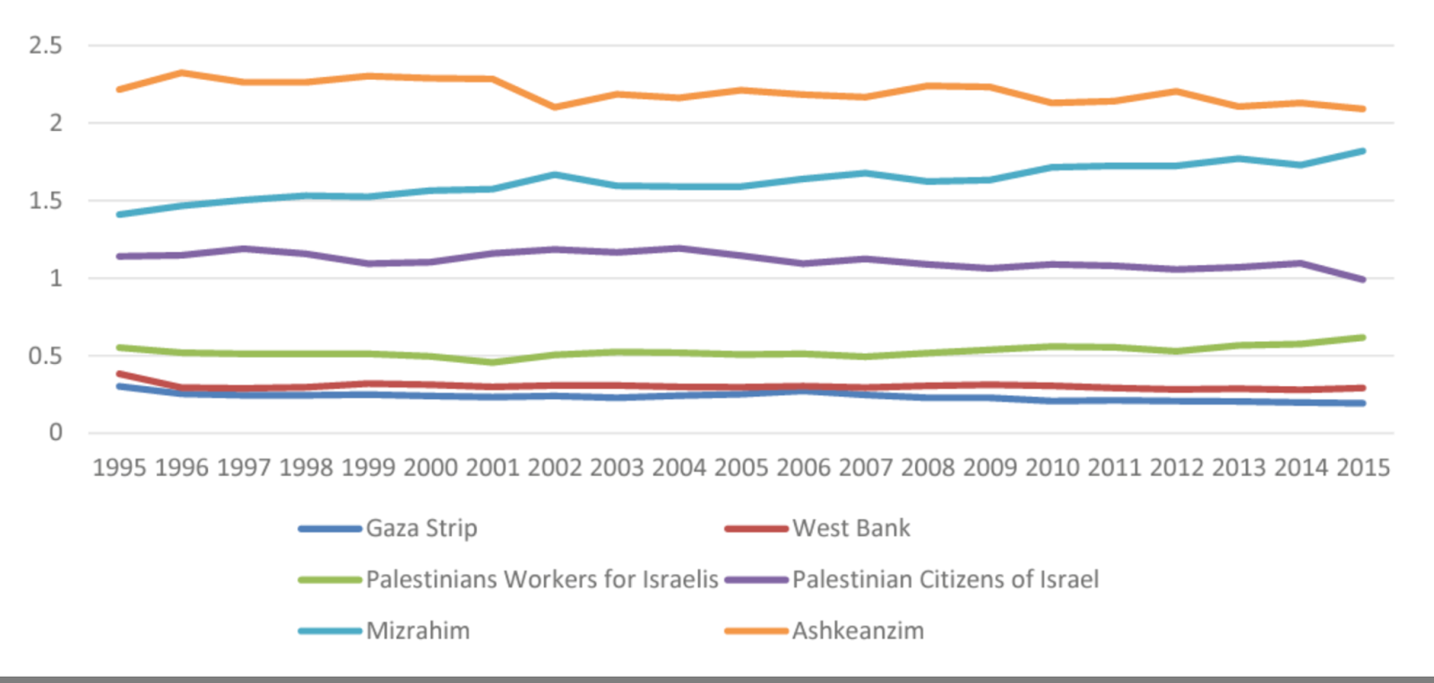 Israeli capitalism was built on nurturing a racism, that is hard baked by an objective and daily economic reality of inequity. This is shown below where a hierarchical gradient in wages of the Israeli proletariat is shown, based on citizenship (yes or no) and identity (Palestinian or not?)
