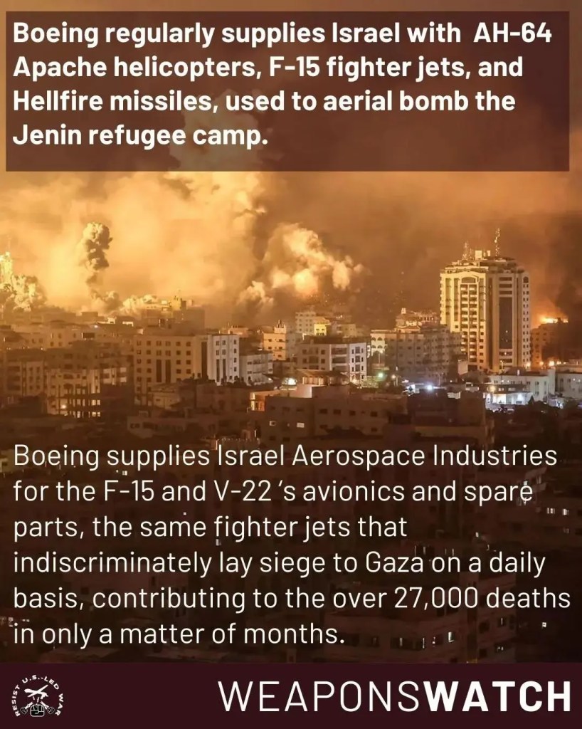 Boeing regularly supplies Israel with AH-64 Apache helicopters, F-15 fighter jets, and Hellfire missiles, used to aerial bomb the Jenin refugee camp. Boeing supplies Israel Aerospace industries for the F-15 and V-22’s avionics and spare parts, the same fighter jets that indiscriminately lay siege to Gaza on a daily basis, contributing to the over 27,000 deaths in only a matter of months.