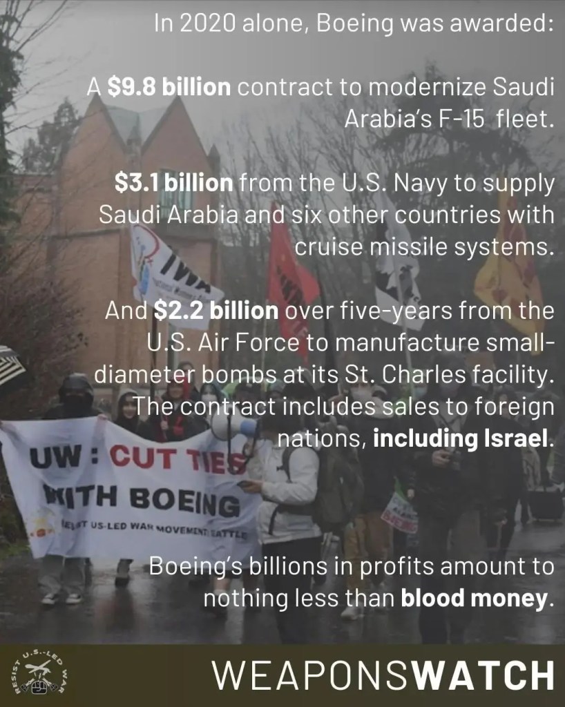 In 2020 alone, Boeing was awarded: A $9.8 billion contract to modernizes Saudi Arabia’s F-15 fleet; $3.1 billion from the US Navy to supply Saudi Arabia and six other countries with cruise missile systems; and $2.2 billion over five years from the US Air Force to manufacture small-diameter bombs at its St. Charles facility. The contract includes sales to foreign nations, including Israel. Boeing’s billions in profits amount to nothing less than blood money.