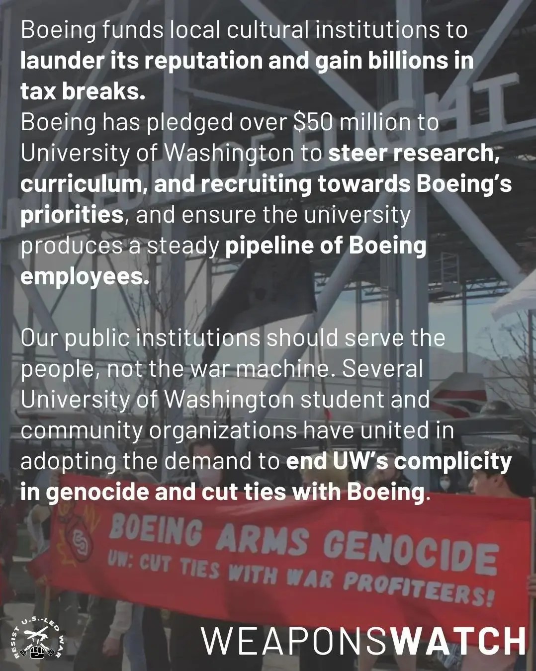 Boeing funds local cultural institutions to launder its reputation and gain billions in tax breaks. Boeing has pledged over $50 million to University of Washington to steer research, curriculum, and recruiting toward Boeing’s priorities, and ensure the university produces a steady pipeline of Boeing employees. Our public institutions should serve the people, not the war machine. Several University of Washington student and community organizations have united in adopting the demand to end UW’s complicity in genocide and cut ties with Boeing.